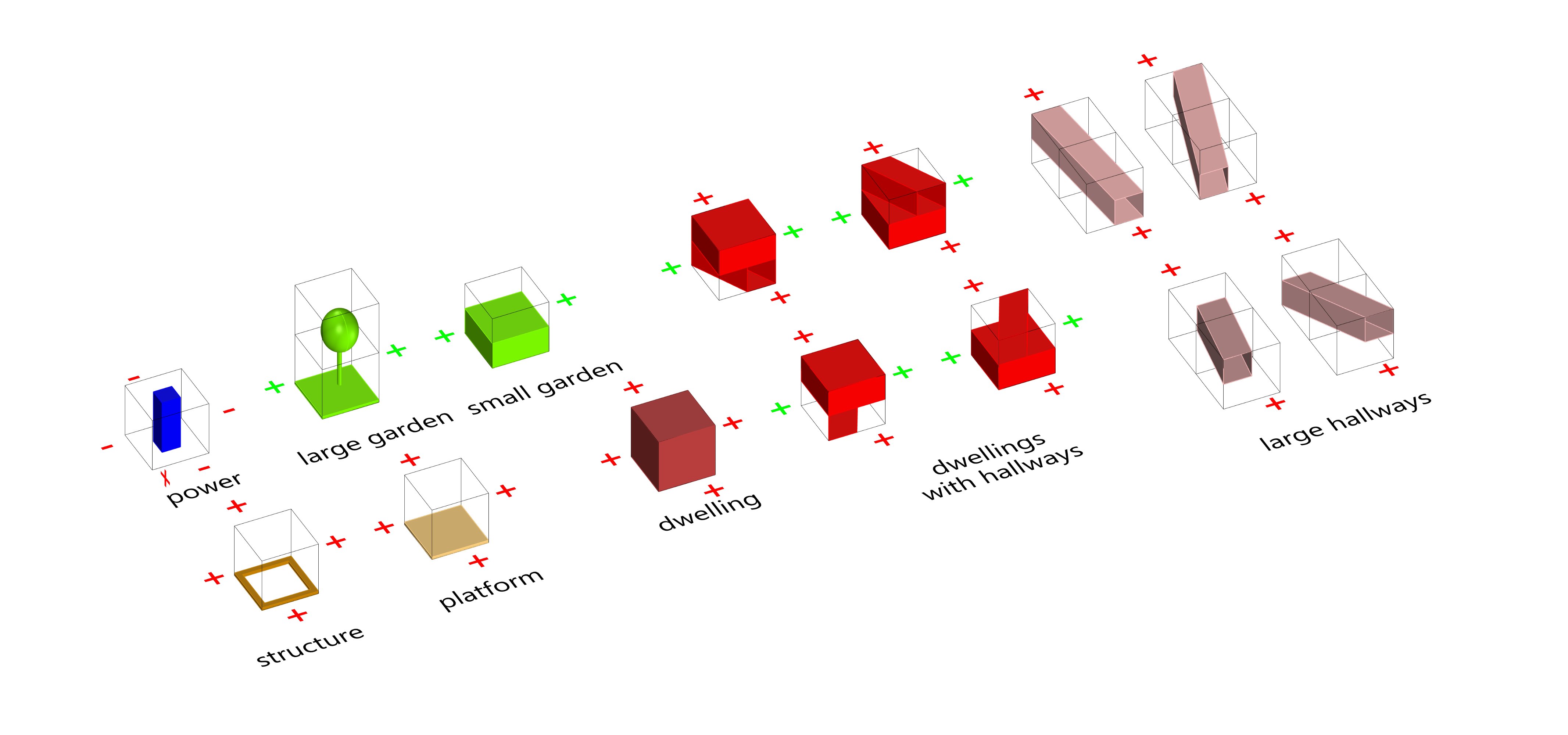 Given mass was understood as space for habitats / architectural program _ such as residential units, public space units, gardens, ateliers, workspaces, corridors and very importantly energy production units contain H2 store facility, solar panels and wind turbos as well as recycling grey water facility. In this synergy effect each cluster could be independently existing and be fully sustainable. Right definition of faces and play with algorithms end up in very nice, differentiated, rich and contextual results.
